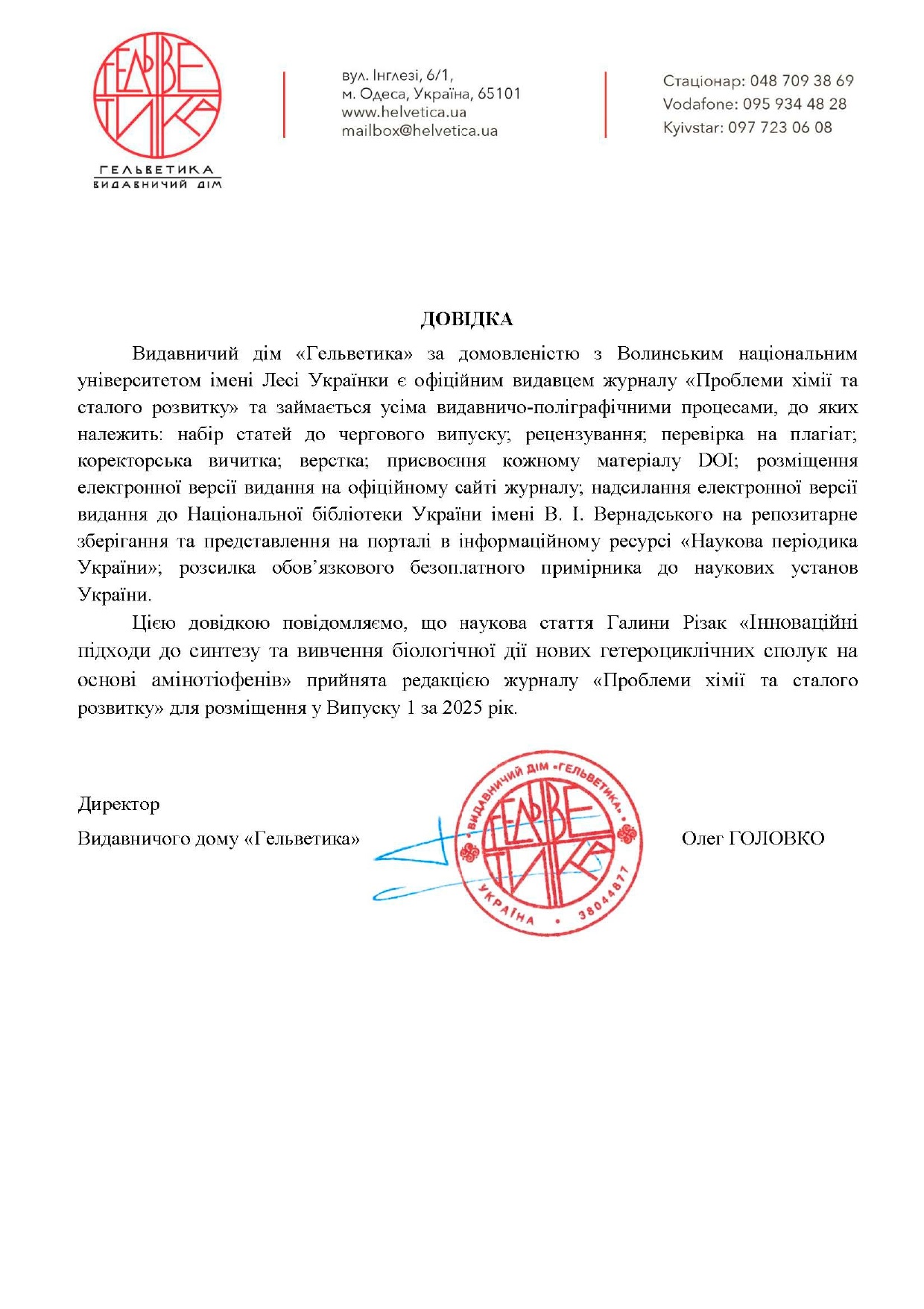 Стаття «Інноваційні підходи до синтезу та вивчення біологічної дії нових гетероциклічних сполук на основі амінотіофенів» відомої вченої у галузі органічної хімії Галини Вікторівни Різак побачить світ у найближчому випуску авторитетного хімічного журналу «Проблеми хімії та сталого розвитку».