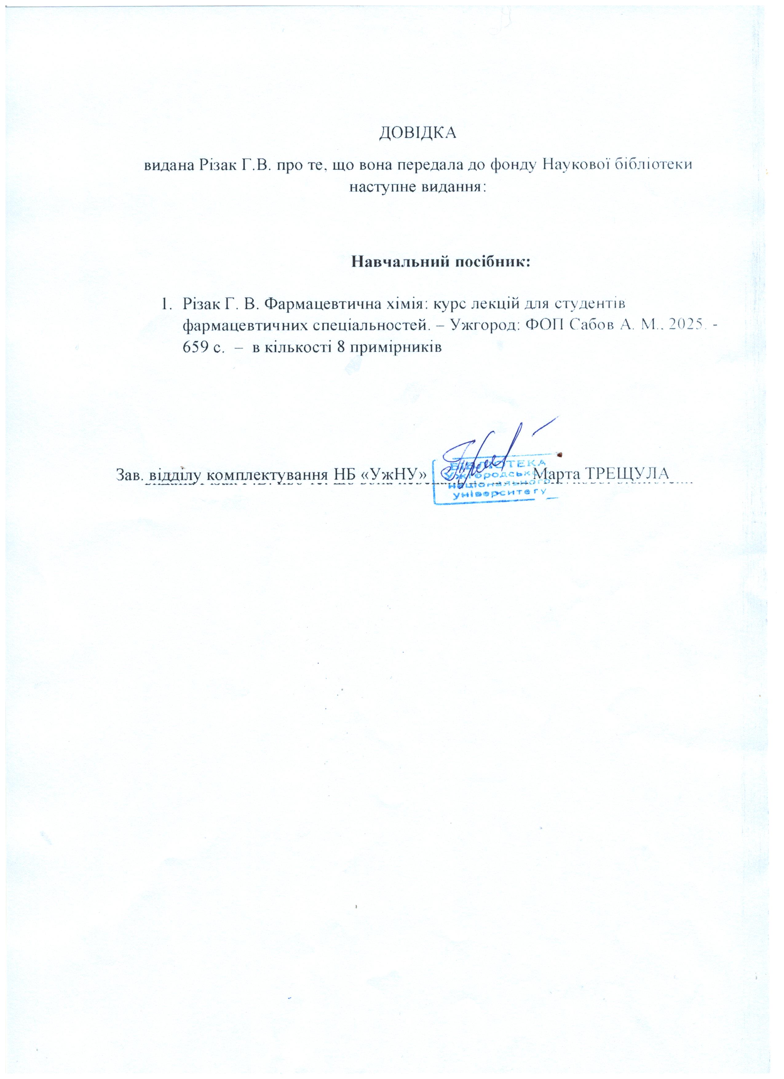 3. Різак, Г.В. Фармацевтична хімія. Курс лекцій: для студентів фармацевтичних спеціальностей .. - Ужгород : ФОП Сабов А. М., 2025.- 659 с.