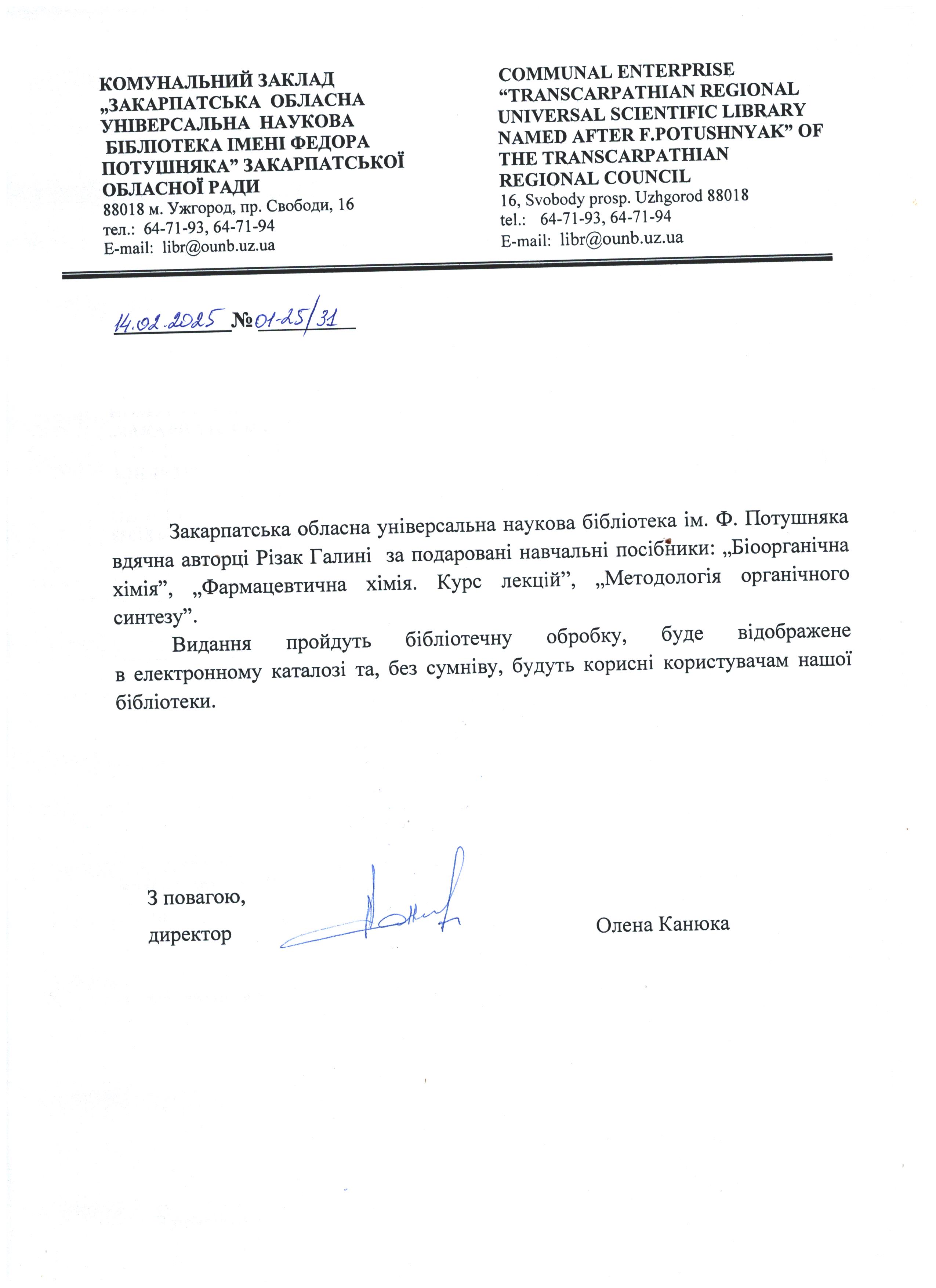 Дякуємо професору, докттору фізико-математичних наук Василю Різаку та директору Олені Канюці за організаційну допомогу при передачі книг.