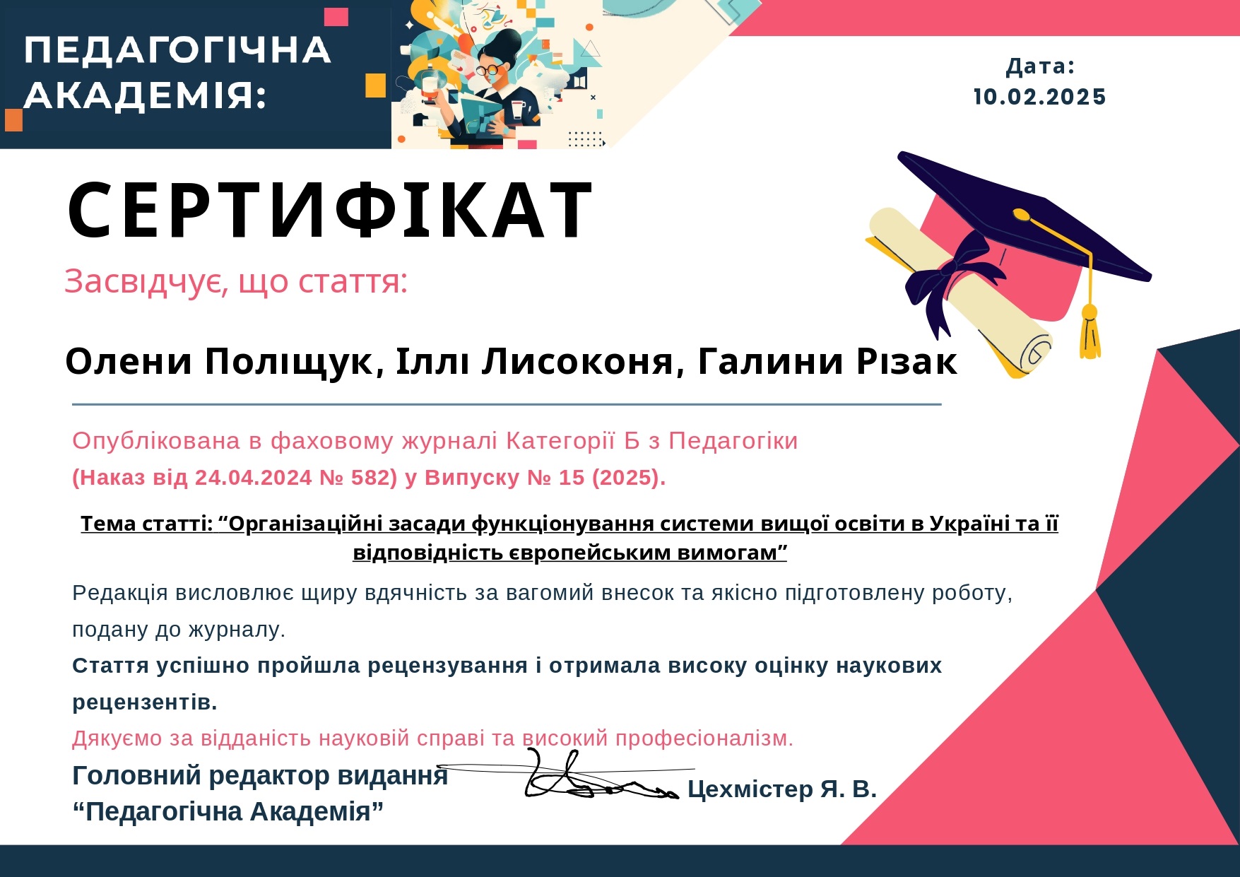 Авторитетна вчена у галузі органічної хімії, викладачка органічної, біоорганічної та фармацевтичної хімії з понад тридцяти річним стажем Галина Вікторівна Різак у співавторстві з колегами з провідних вузів України рамках наукової статті "Організаційні засади функціонування системи вищої освіти в Україні та її відповідність європейським вимогам", опублікоіаної у відомому науковому журналі, поділилася своїм баченням організаційних засад функціонування вищої освіти України.