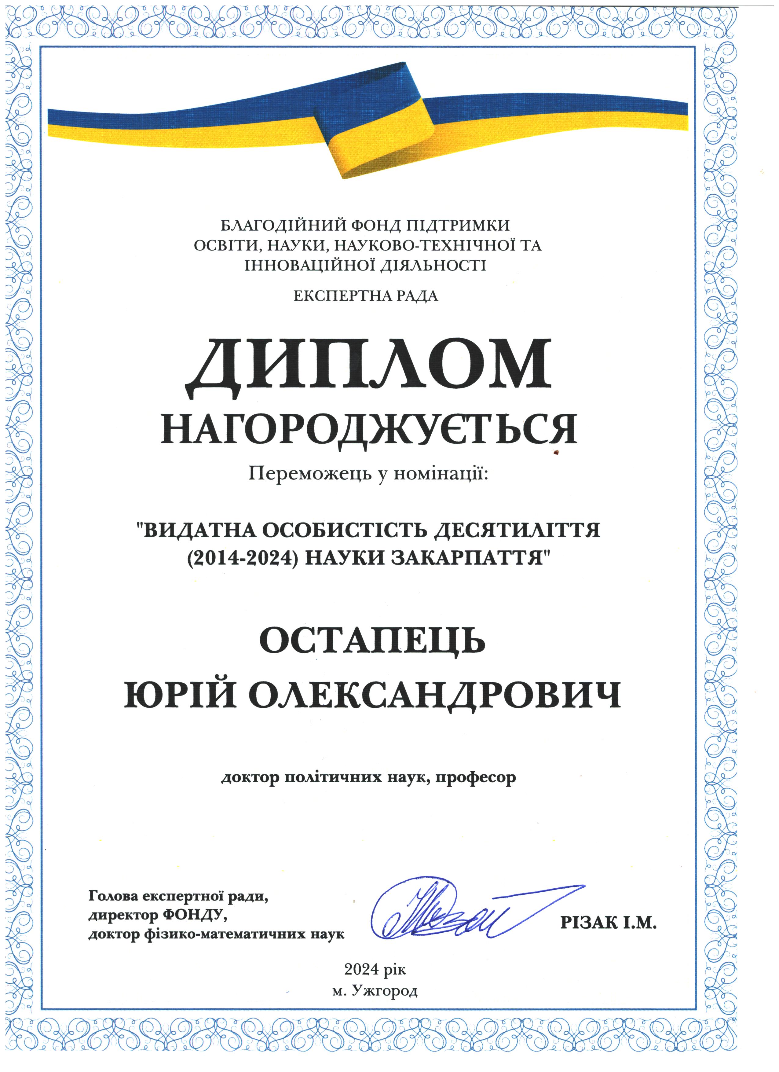 Вітаємо Юрія Олександровича Остапця з перемогою у номінації "Видатна особистість десятиліття (2014-2024) науки Закарпаття"!
