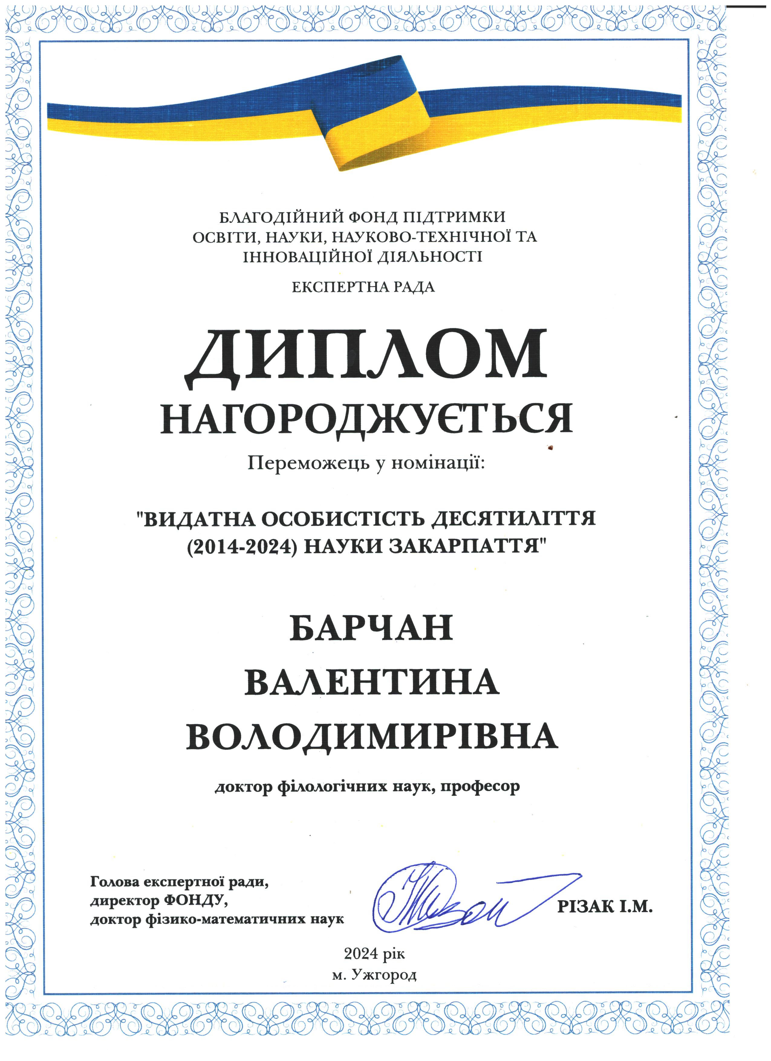 Вітаємо Валентину Володимирівну Барчан з перемогою у номінації "Видатна особистість десятиліття (2014-2024) науки Закарпаття!