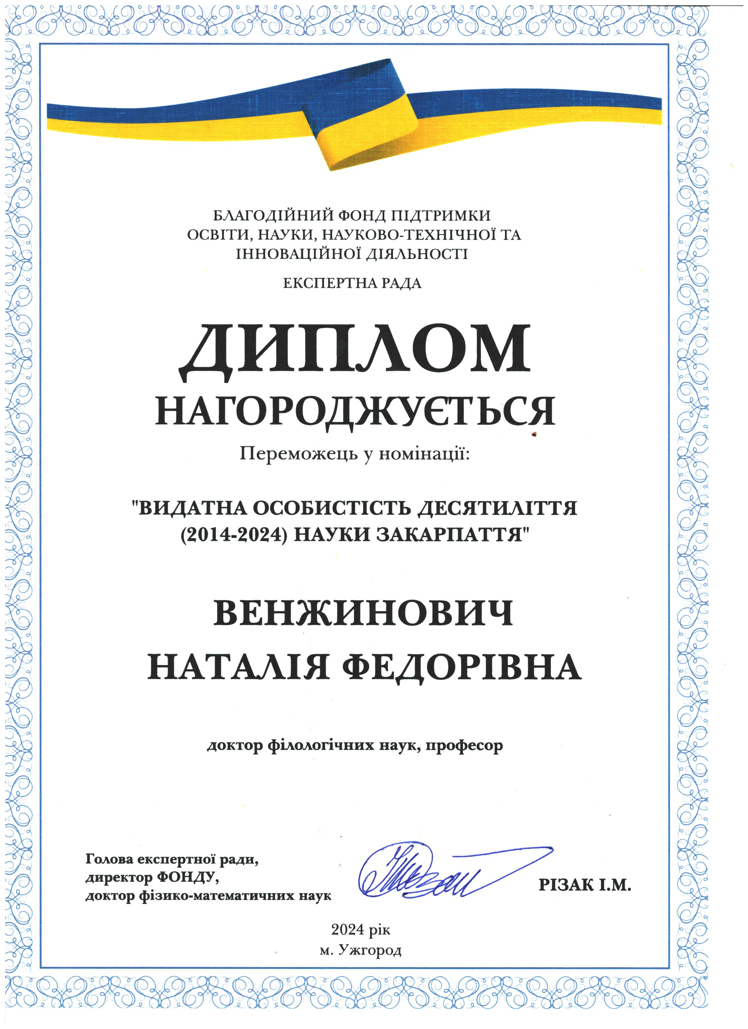 Вітаємо Наталію Федорівну Венжинович з перемогою у номінації "Видатна особистість десятиліття (2014-2024) науки Закарпаття!