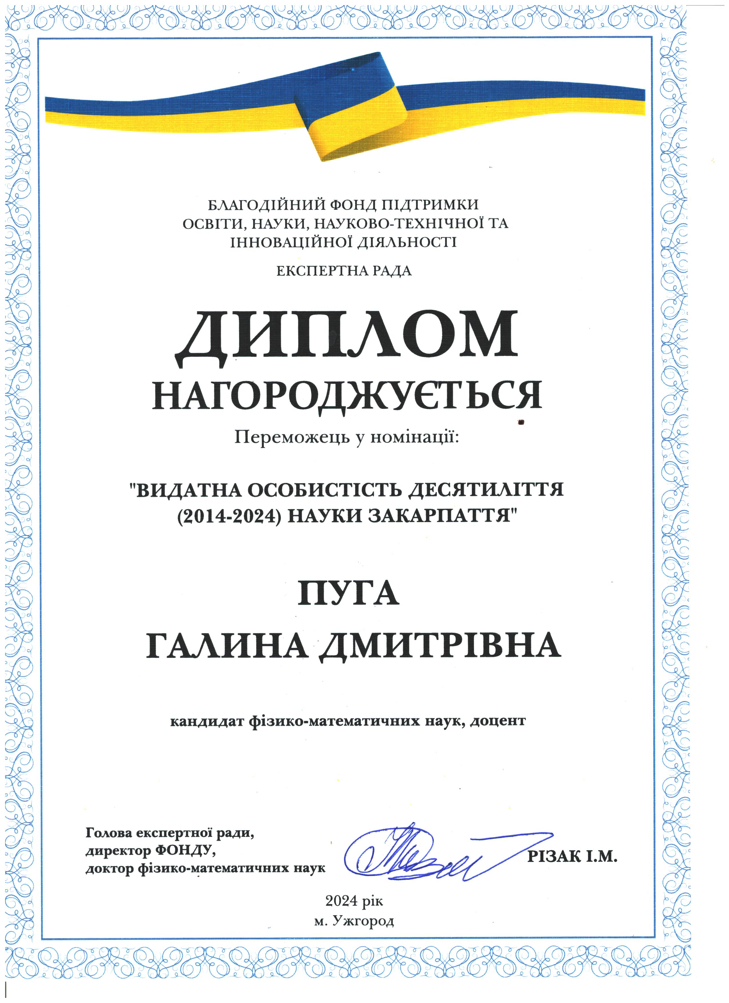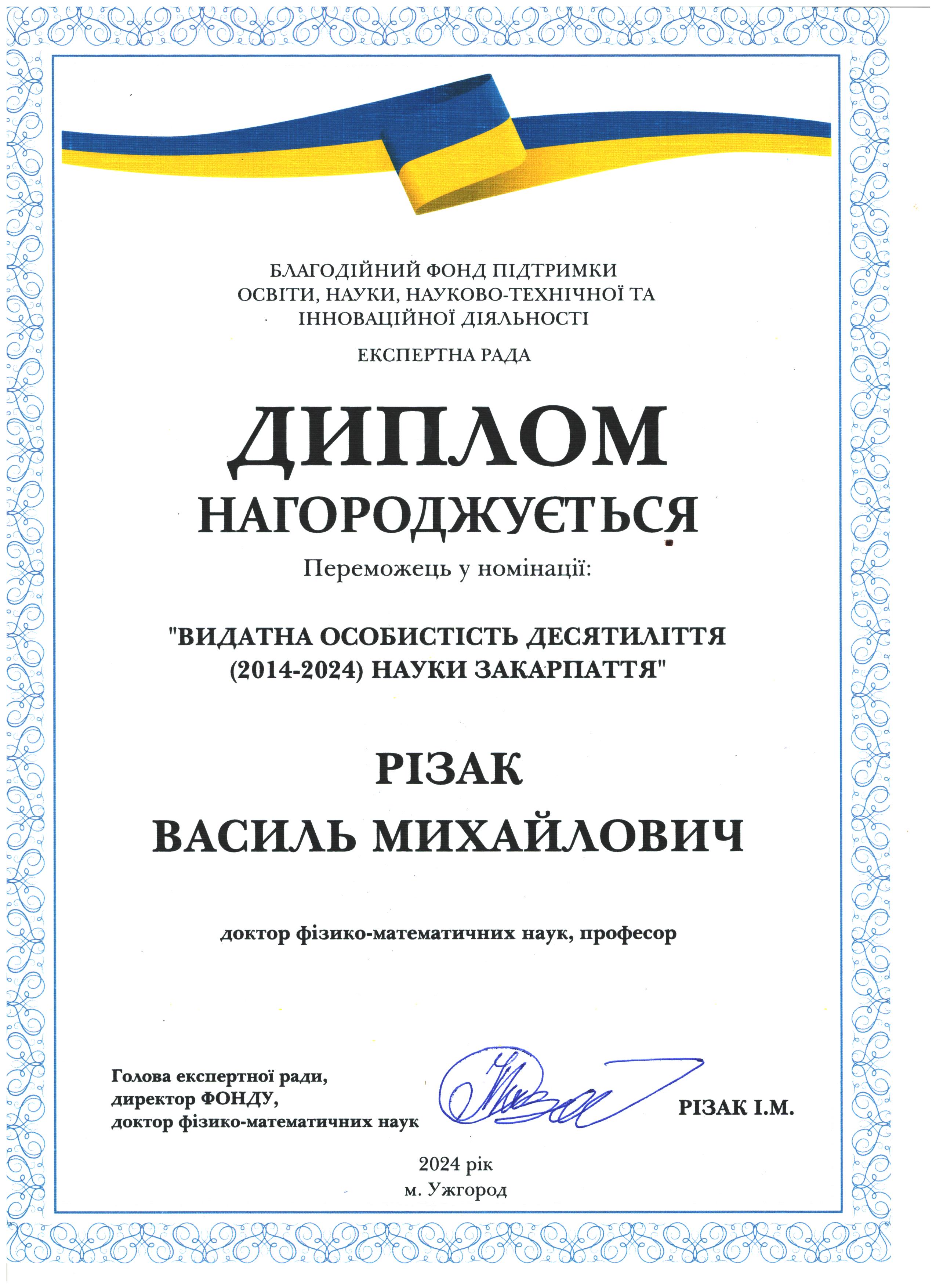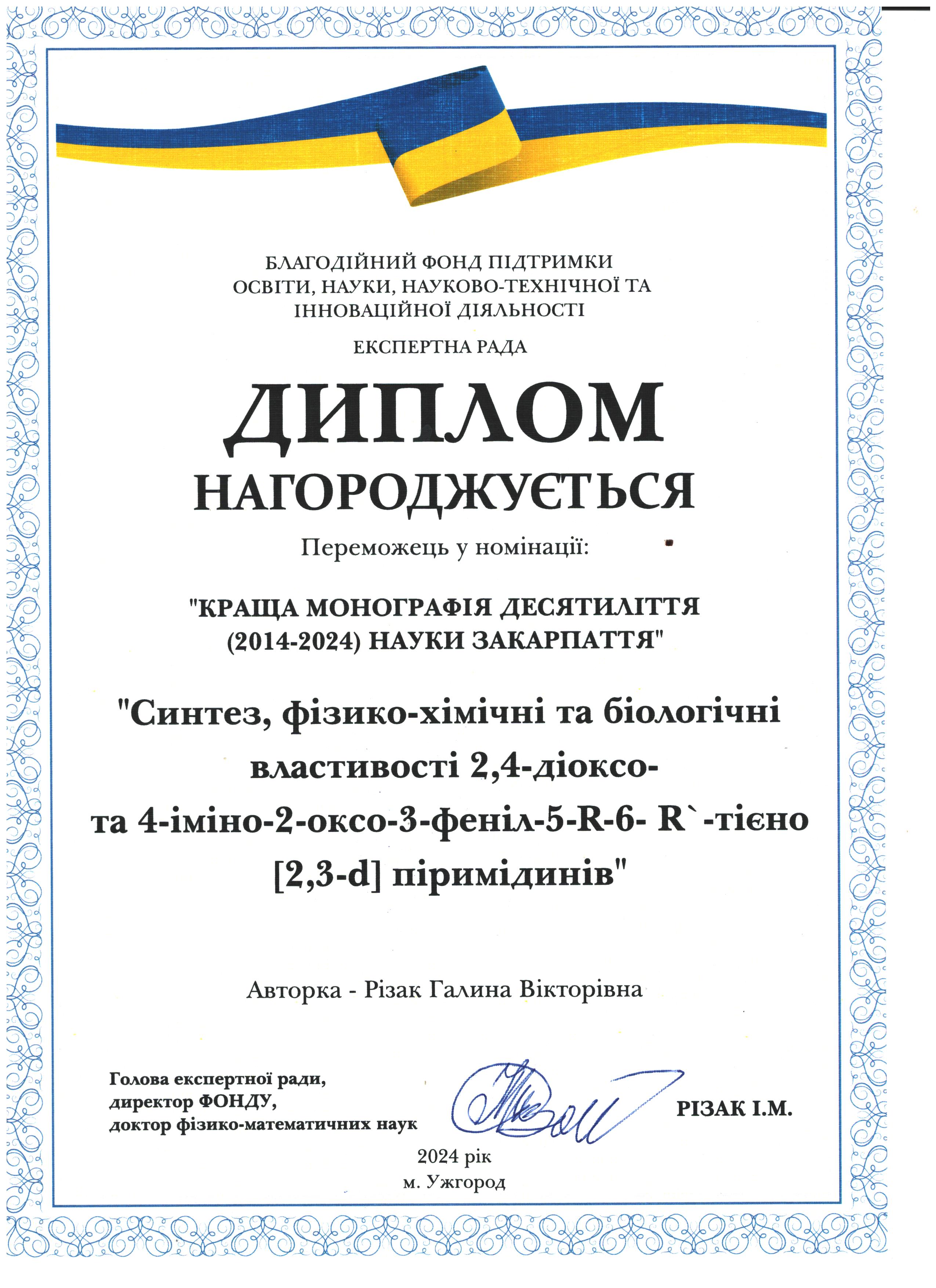 Іван Різак: дякую тобі, моя Галино Вікторівно, за витримку у нашій багатолітній боротьбі за честь сім'ї і не тільки, Рвдію за тебе і твої нові наукові успіхи у галузі органічної хімії завдяки підтримці колег з провідних вузів України. Тримайся!