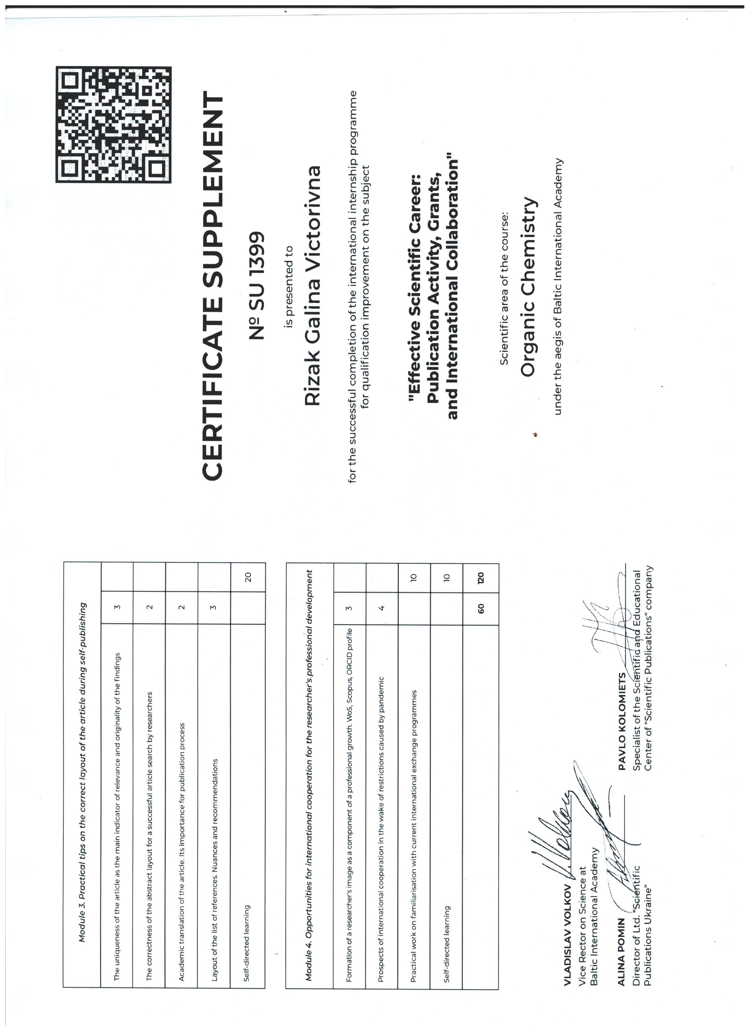 Відома вчена у галузі органічної хімії Галина Вікторівна Різак завершила міжнародне науково-педагогічне стажування на базі Балтійської міжнародної академії (м. Рига) та отримала сертифікат міжнародного взірця.