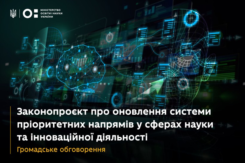 Громадське обговорення законопроєкту про оновлення системи пріоритетних напрямів у сферах науки та інноваційної діяльності Автор фото – пресслужба Міністерства освіти і науки України Міністерство освіти і науки України пропонує для громадського обговорення проєкт Закону України «Про внесення змін до деяких законів України щодо оновлення системи пріоритетних напрямів у сферах наукової, науково-технічної та інноваційної діяльності».