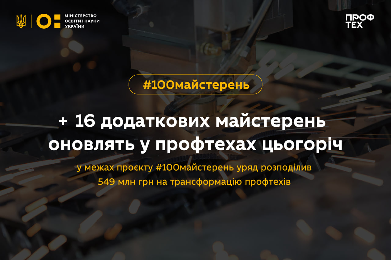 Проєкт #100майстерень — це програма для створення сучасних навчально-практичних центрів у закладах професійної освіти. У 2024 році в державному бюджеті на це було передбачено 500 млн грн, а сьогодні уряд перерозподілив додатково ще 49 млн грн.