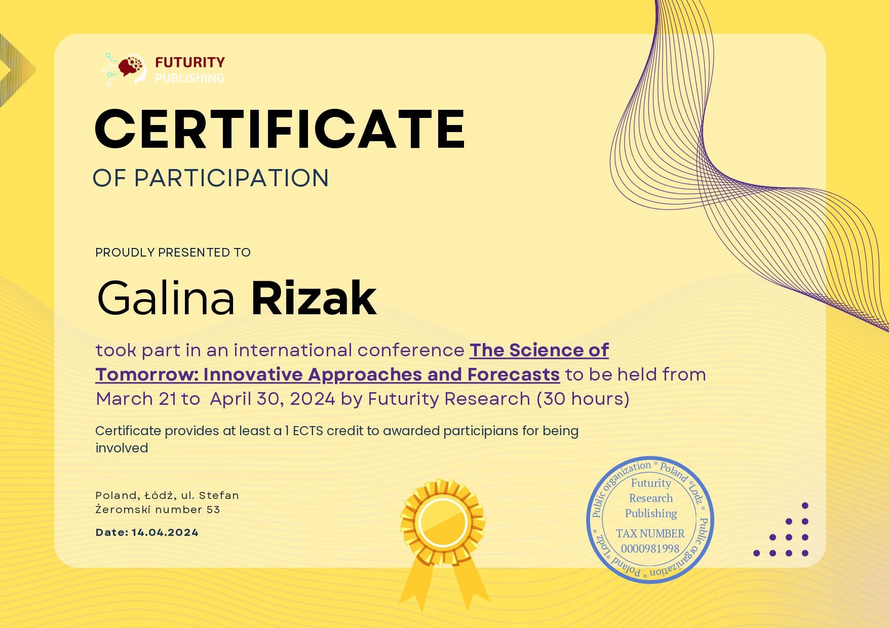 Відома науковиця в галузі органічної хімії кандидатка фармацевтичних наук Галина Вікторівна Різак виступить з доповіддю " Study of the diuretic activity of ethyl 3-R-4-R`-2-aminothiophene-3-carboxylates, nitriles of 3-R-4-R`-2-aminothiophene-3-carboxylic acids, their ureide derivatives, 2,4-dioxo- and 4-imino-2-oxo-3-phenyl-5-R-6-R`- thieno[2,3-d]pyrimidines* (Вивчення діуретичної активності етил 3-R-4-R`-2-амінотіофен-3-карбоксилатів, нітрилів 3-R-4-R`-2- амінотіофен-3-карбонових кислот, їх уреїдних похідних, 2,4-діоксо- та 4-іміно-2-оксо-3-феніл-5-R-6-R`-тієно[2,3-d]піримідинів.