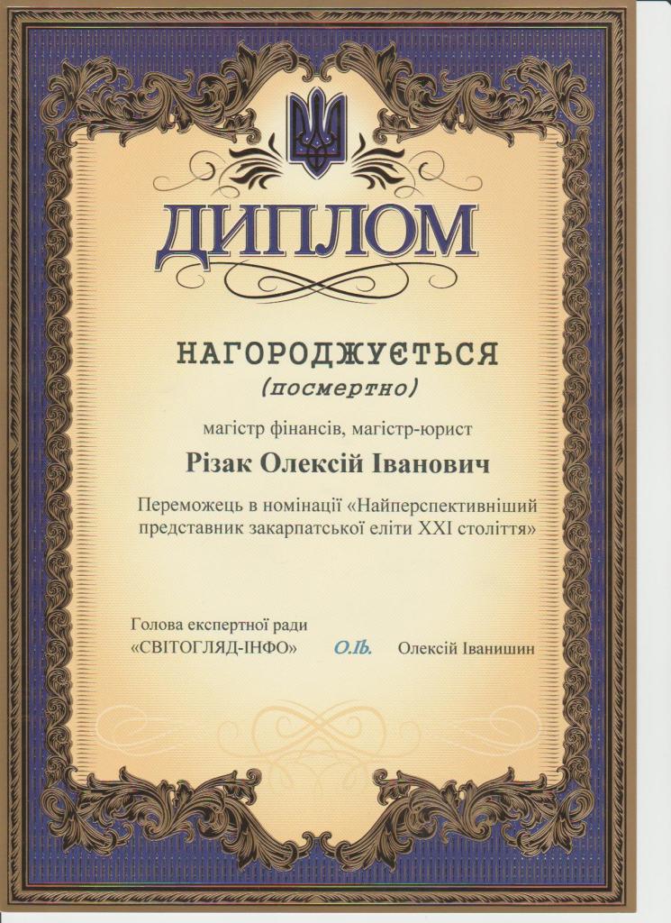 Нам повідомили, що експерти » Світогляду» одноголосно назвали «Найперспективнішим представником закарпатської еліти 21 століття» Олексія Івановича Різака «(посмертно), магістра фінансів, магістра-юриста, блискучого професіонала і високоморальну людину. Вітаємо батьків з цим визнанням! Вічная память Тобі, Олексію! Ти назавжди залишишся прикладом для наслідування в житті для багатьох закарпатців. Світогляд